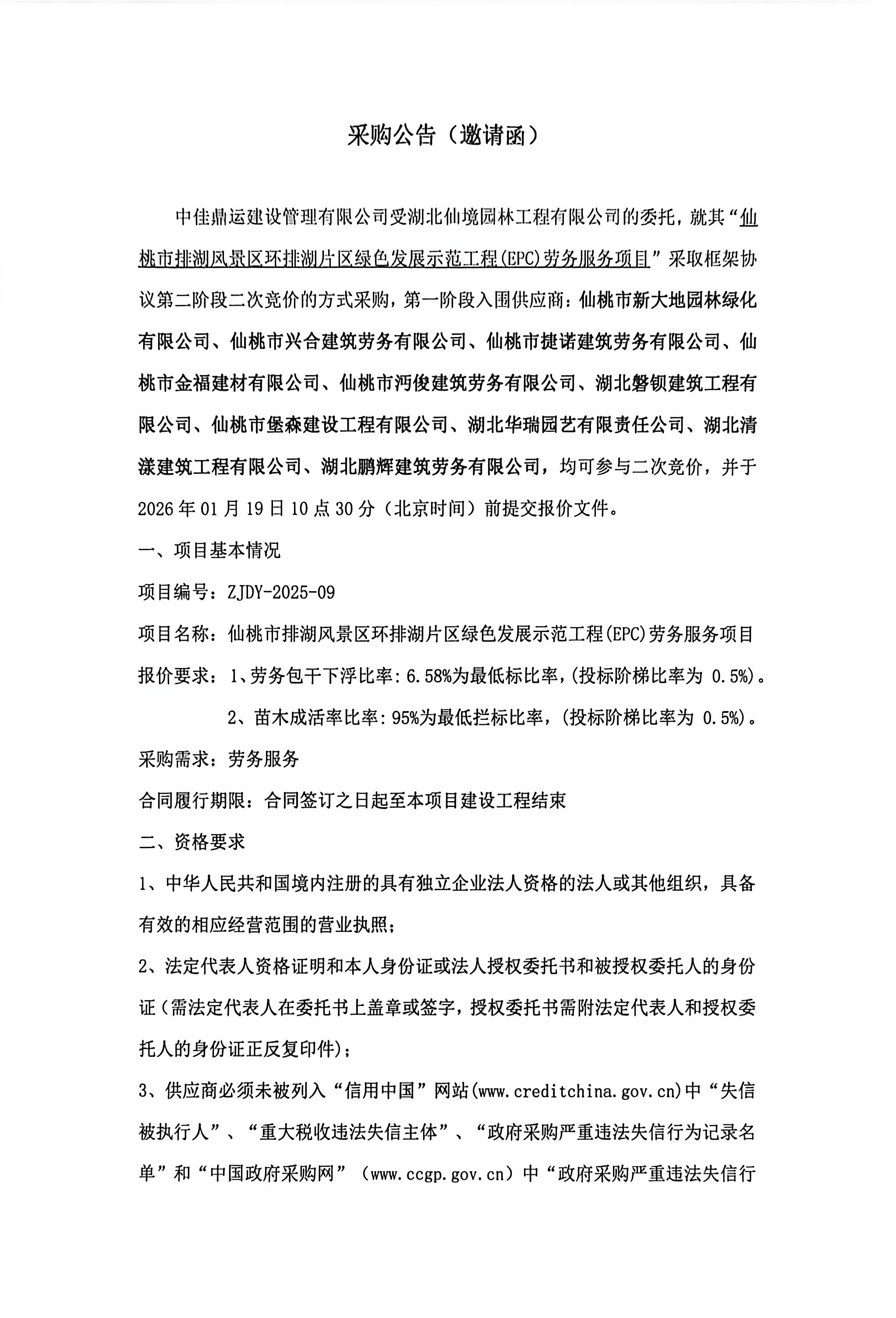 仙桃市排湖风景区环排湖片区绿色发展示范工程(EPC)劳务服务项目--采购公告