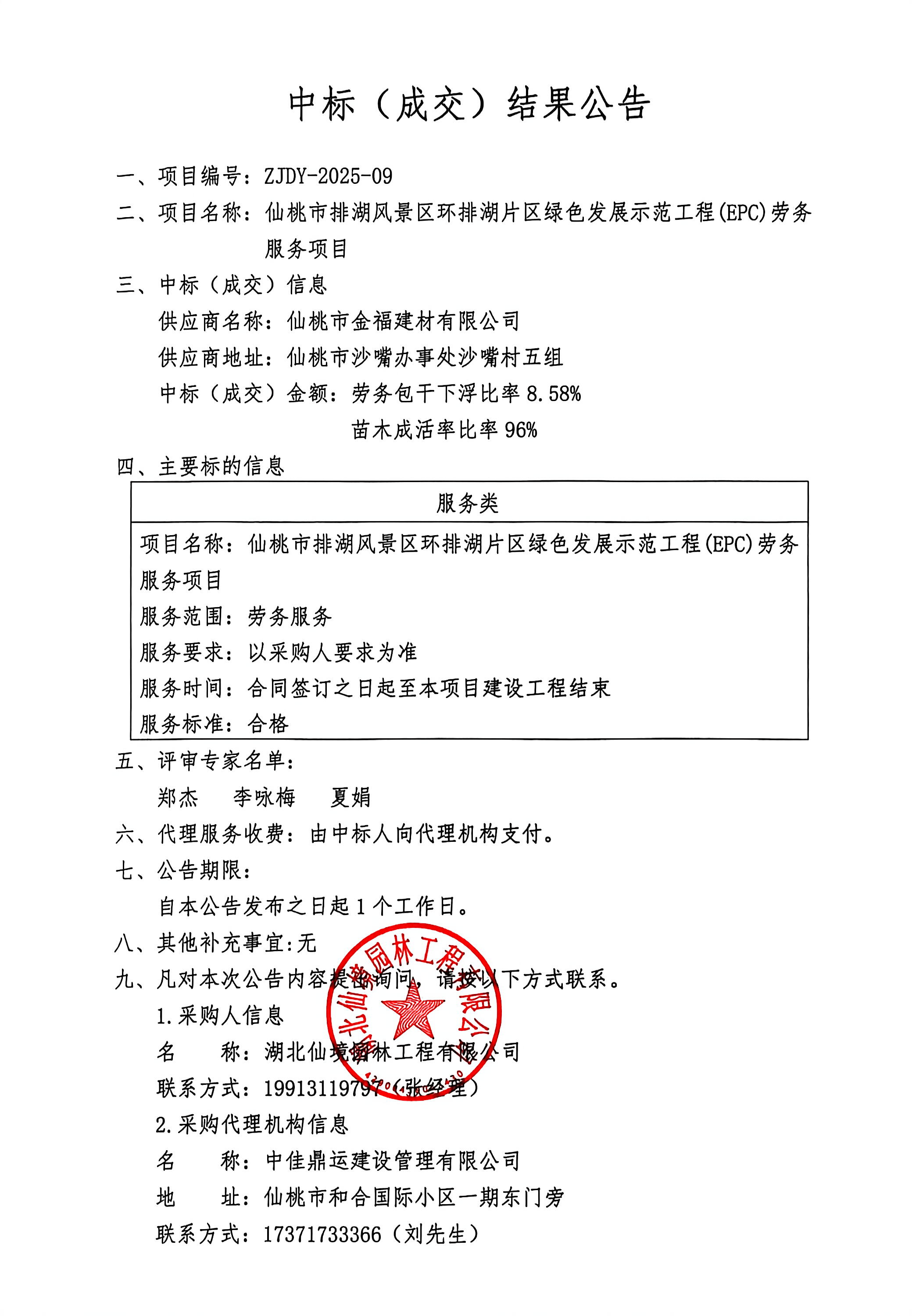 仙桃市排湖风景区环排湖片区绿色发展示范工程(EPC)劳务服务项目--中标(成交)结果公告