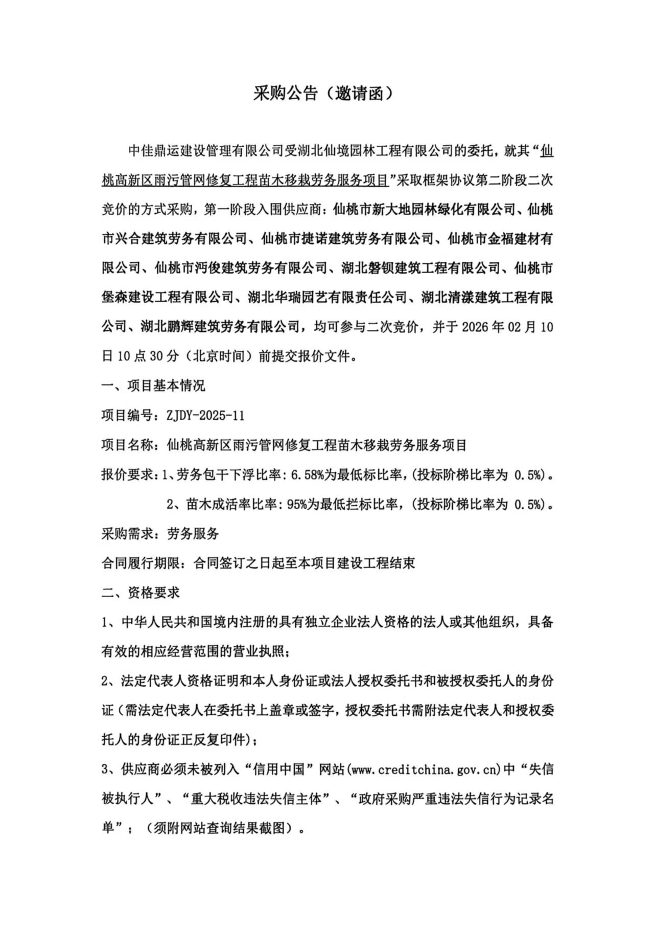 仙桃高新区雨污管网修复工程苗木移栽劳务服务项目—采购公告