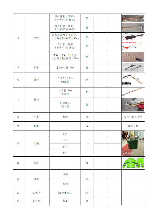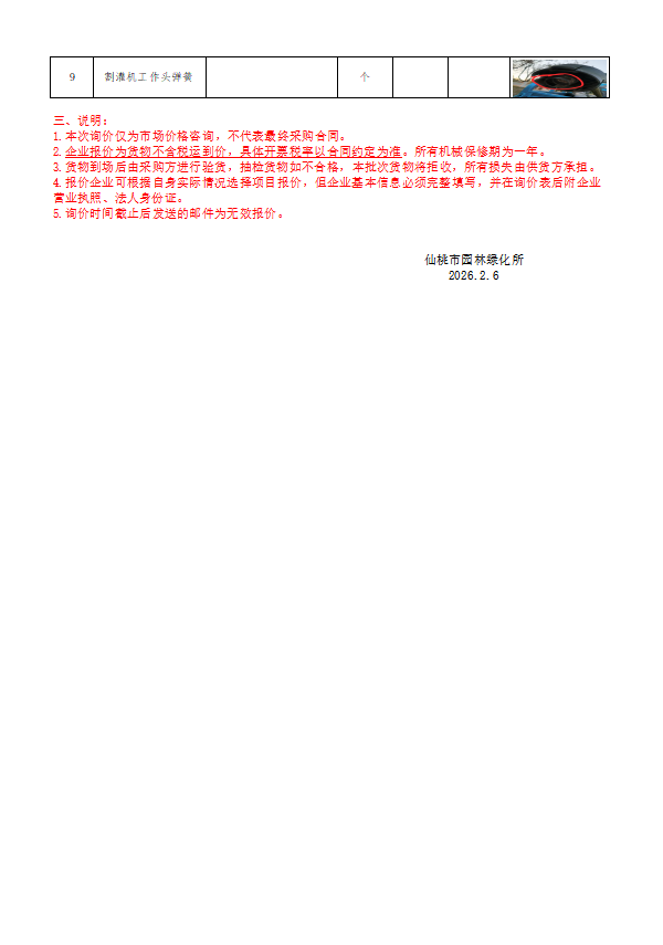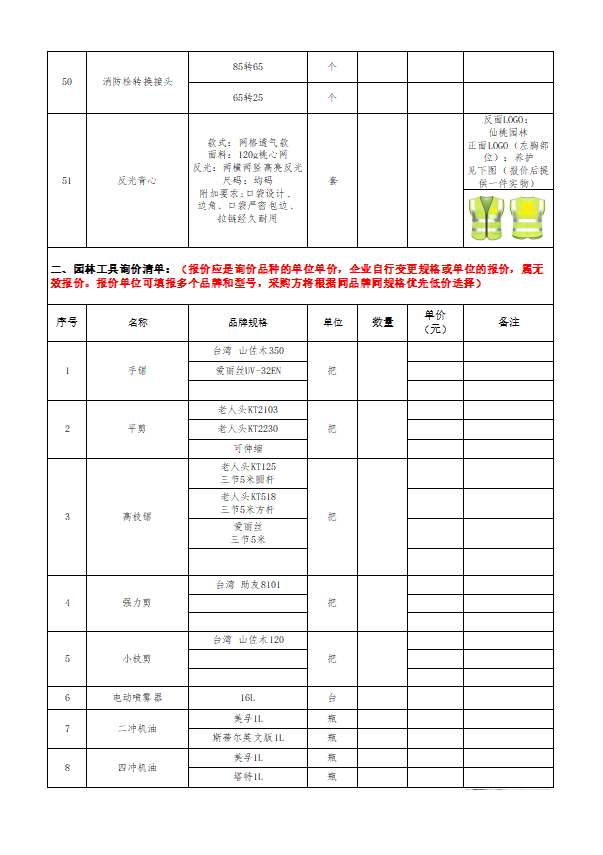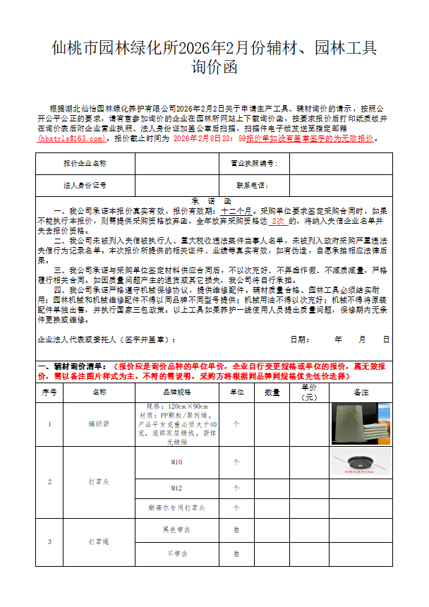 仙桃市园林绿化所2026年2月份辅材、园林工具询价函