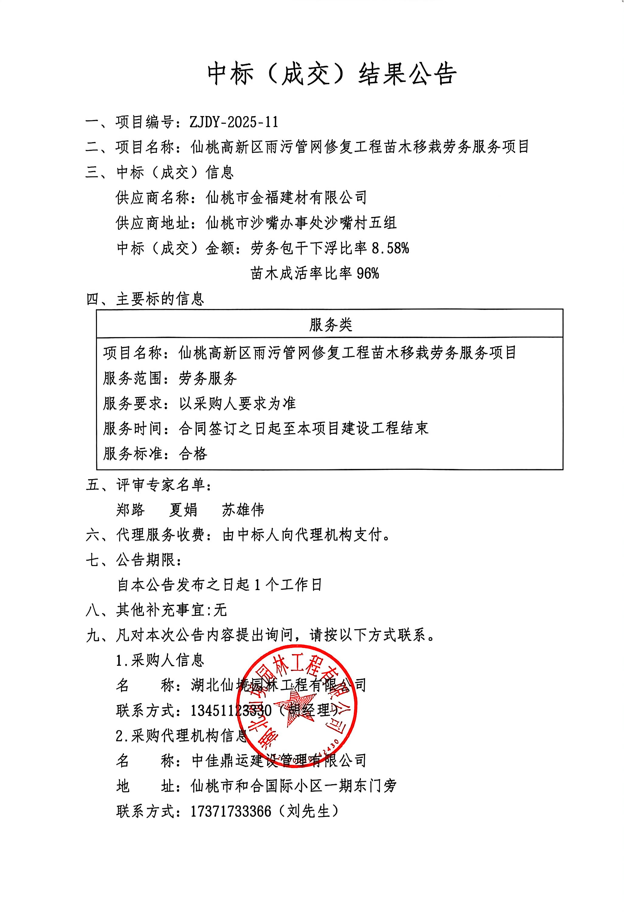 仙桃高新区雨污管网修复工程苗木移栽劳务服务项目--中标(成交)结果公告