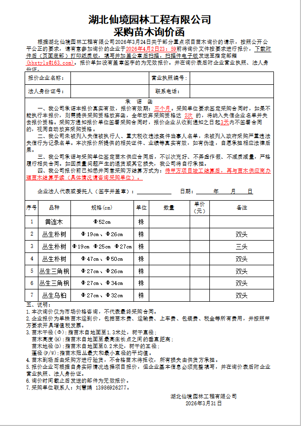 当前位置:首页 > 事务公开 > 通知公告 > 湖北仙境园林工程有限公司采购苗木询价函